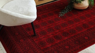 Bordowy dywan z ozdobną ramką w orientalnym stylu, który nada salonowi elegancki i tradycyjny charakter.