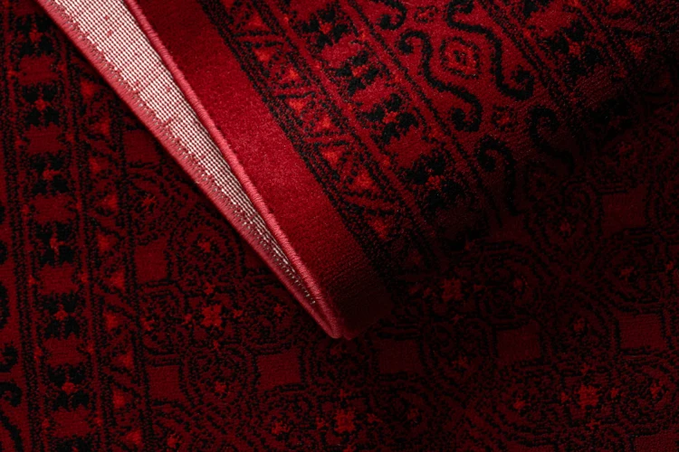 Bordowy dywan z ozdobną ramką w orientalnym stylu, który nada salonowi elegancki i tradycyjny charakter.
