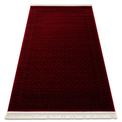 Bordowy dywan z orientalnym wzorem w ramce, który nada salonowi elegancki, tradycyjny charakter.