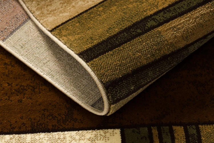 Brązowo-czarny dywan z geometrycznym wzorem 3D, który nada salonowi nowoczesny charakter i głębię optyczną.