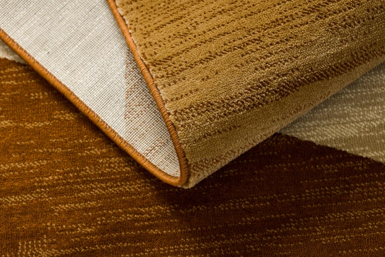 Beżowo-brązowy dywan z geometrycznym wzorem, który wprowadzi do salonu elegancki porządek i ciepłą atmosferę.