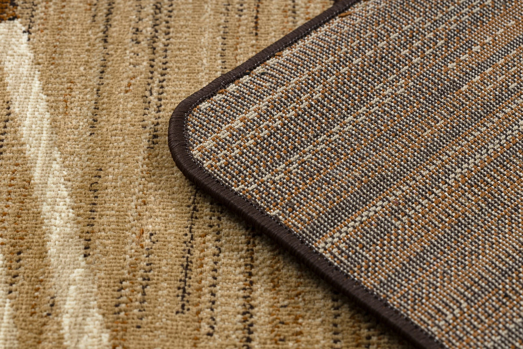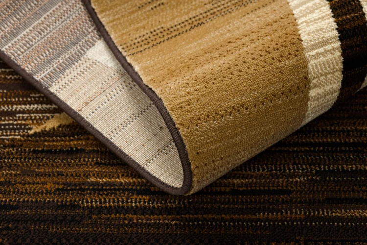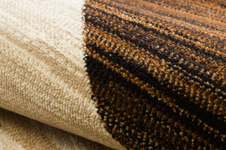 Brązowo-beżowy dywan z geometrycznym wzorem, który doskonale sprawdzi się w salonie, dodając wnętrzu ciepły, nowoczesny charakter.