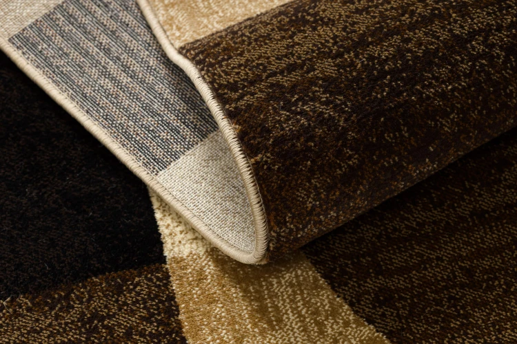 Beżowo-kremowy dywan z geometrycznym wzorem, który doda salonowi elegancki charakter w nowoczesnym stylu.