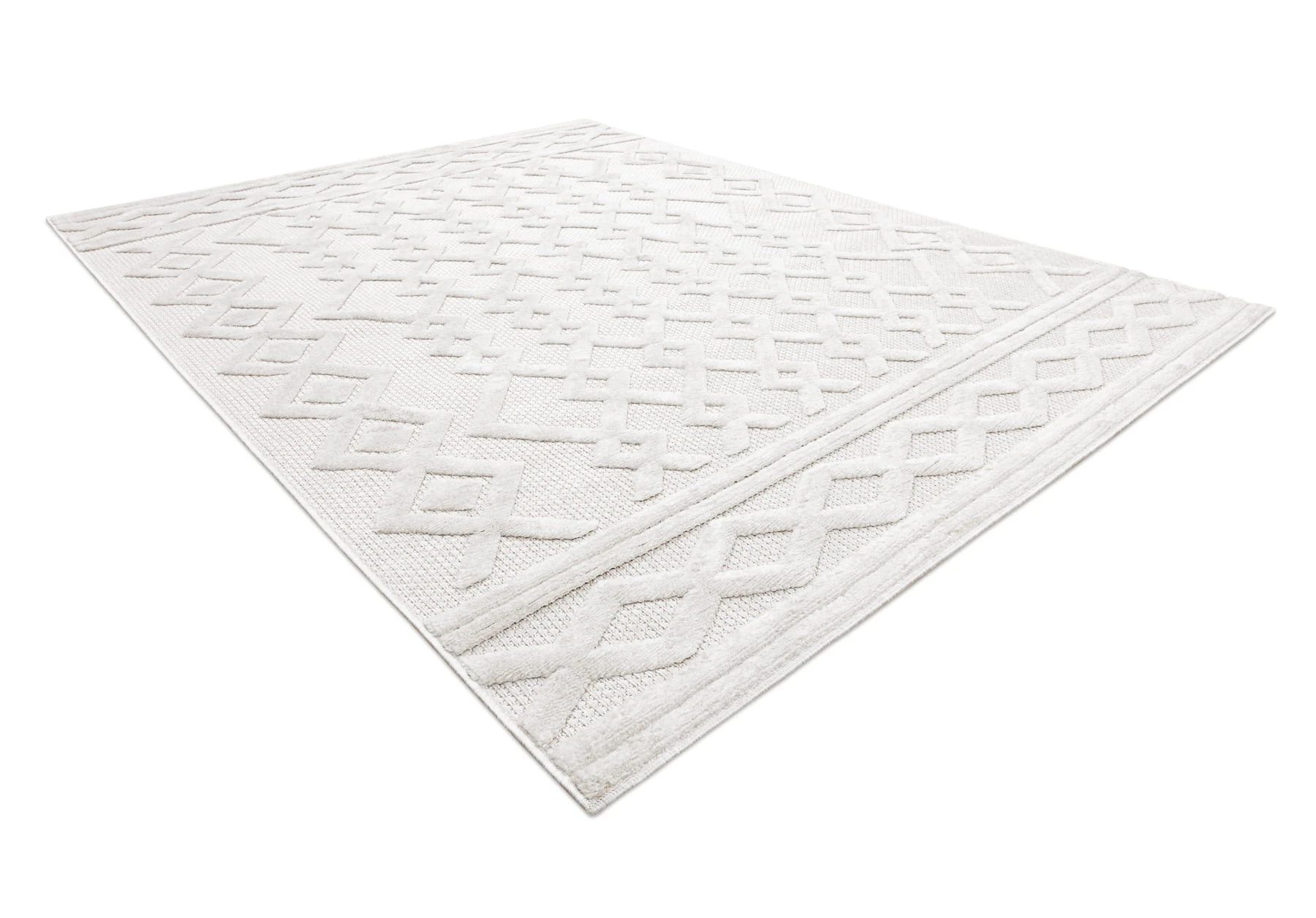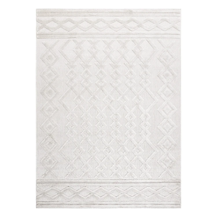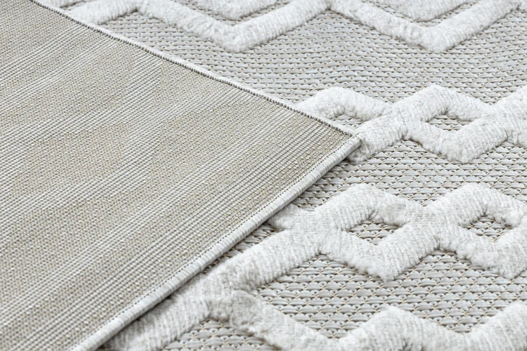 Beżowy dywan z geometrycznym wzorem w romby i zygzaki, który doskonale wpisze się w salon lub pokój, dodając wnętrzu nowoczesny charakter.