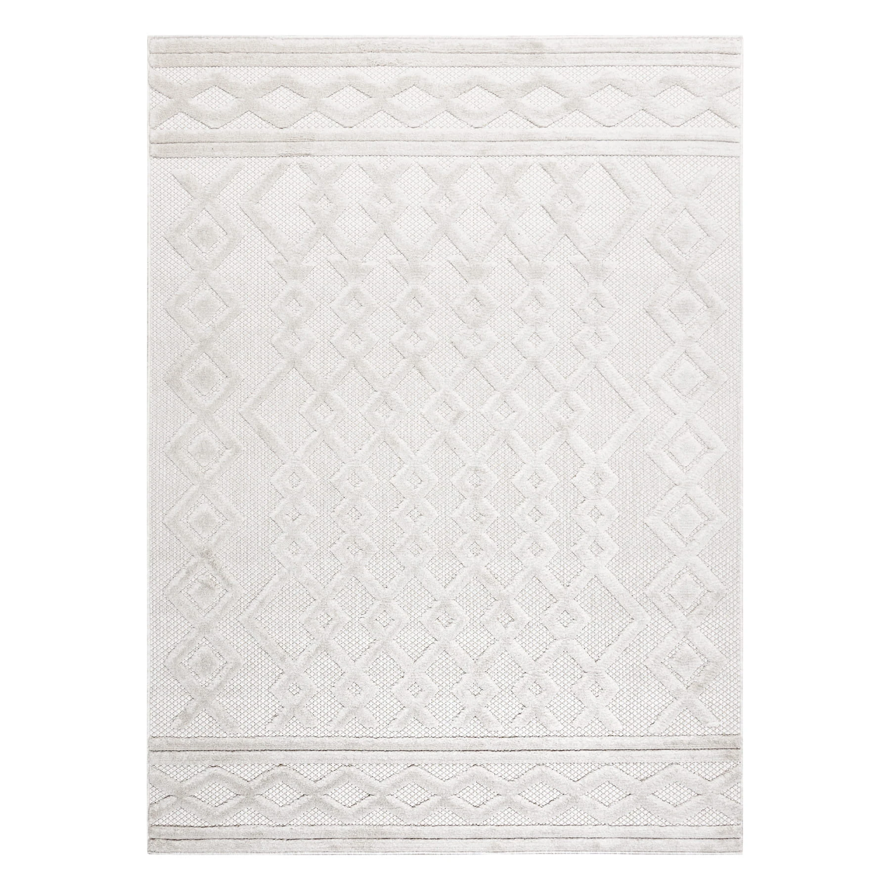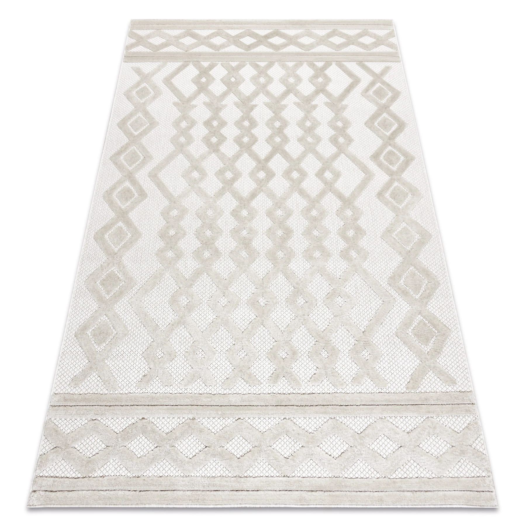 Beżowy dywan z geometrycznym wzorem w romby i zygzaki, który doskonale wpisze się w salon lub pokój, dodając wnętrzu nowoczesny charakter.