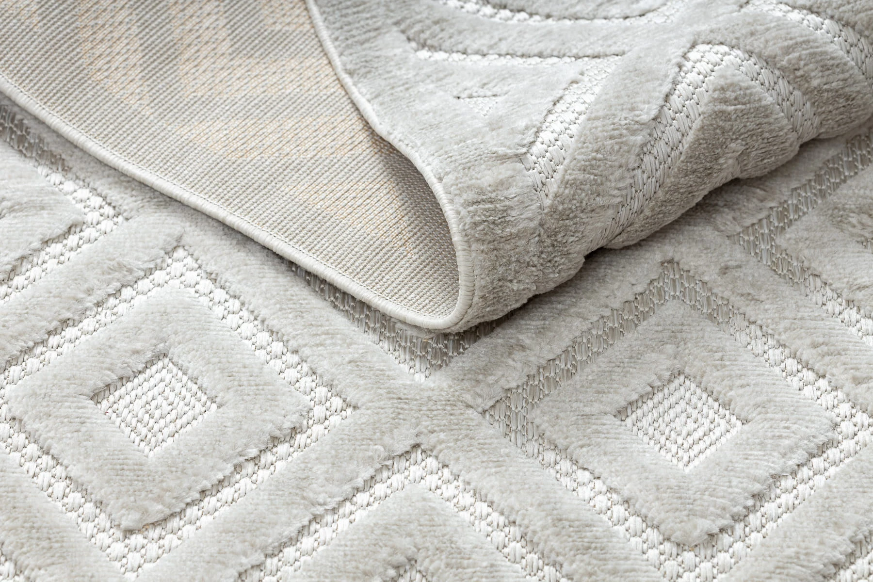Beżowy dywan z geometrycznym wzorem rombów, który wprowadzi do salonu ciepły, stonowany akcent w nowoczesnym stylu.
