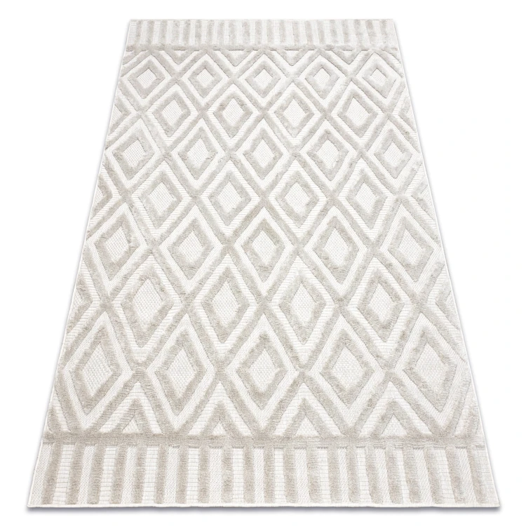 Beżowy dywan z geometrycznym wzorem zygzak, który doskonale uzupełni salon lub pokój w naturalnym stylu.