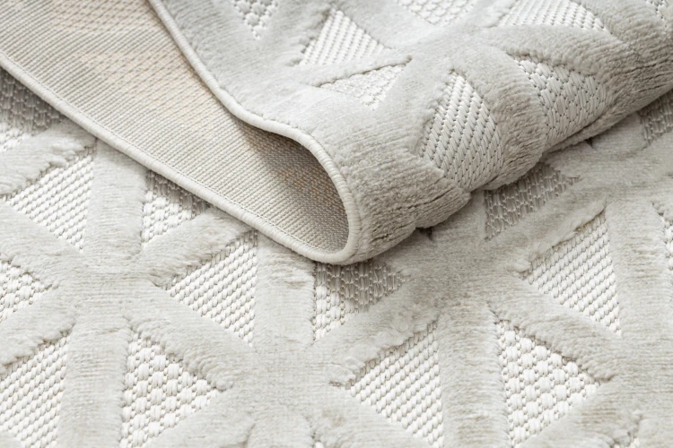 Beżowy dywan z geometrycznym wzorem trójkątów, który doskonale sprawdzi się w salonie, dodając wnętrzu nowoczesny charakter.