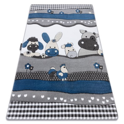 Niebieski dywan dziecięcy w skandynawskim stylu, który idealnie sprawdzi się w pokoju dziecka lub salonie rodzinnym.