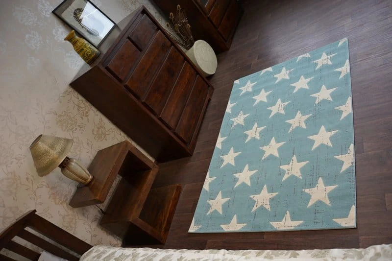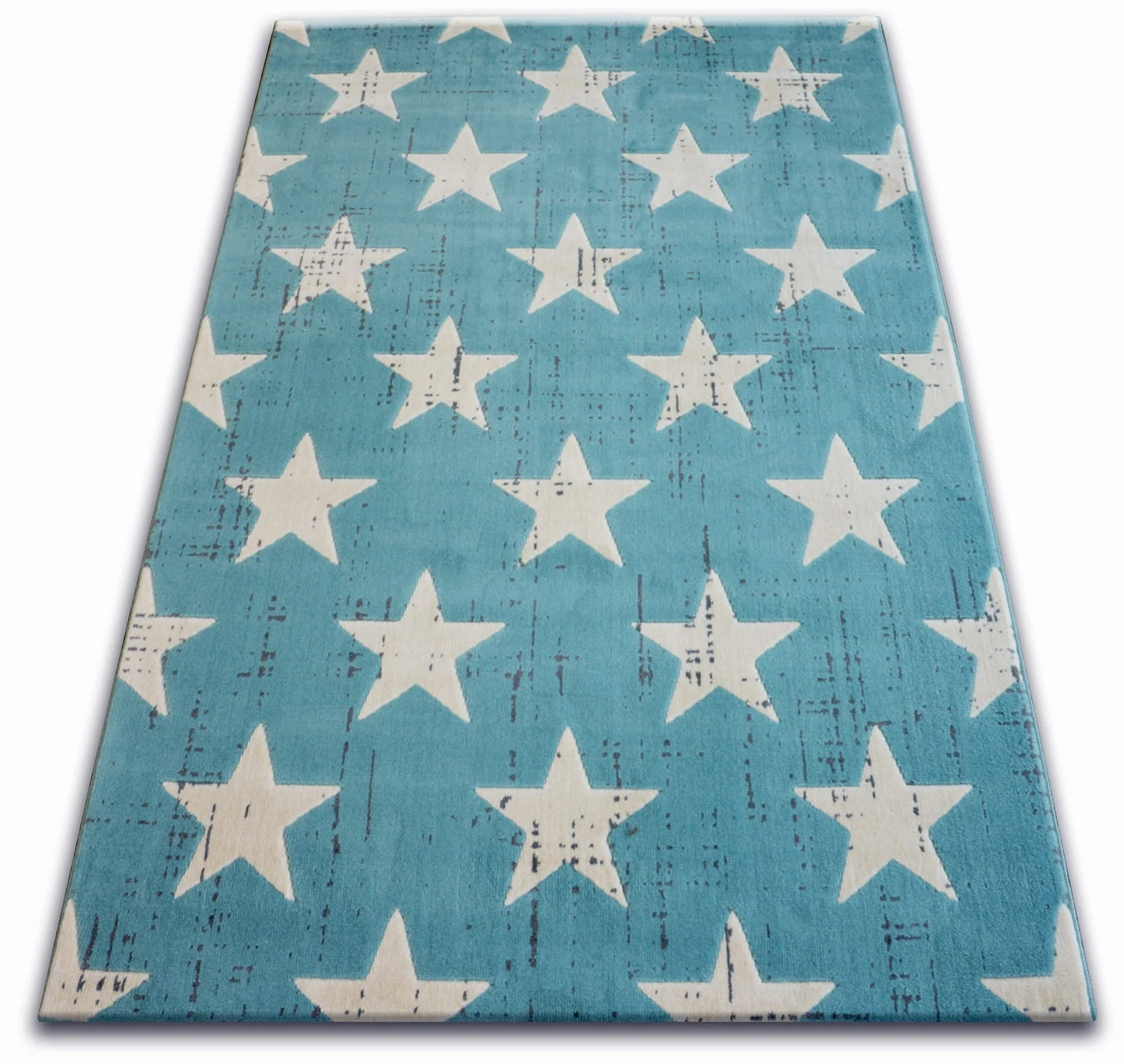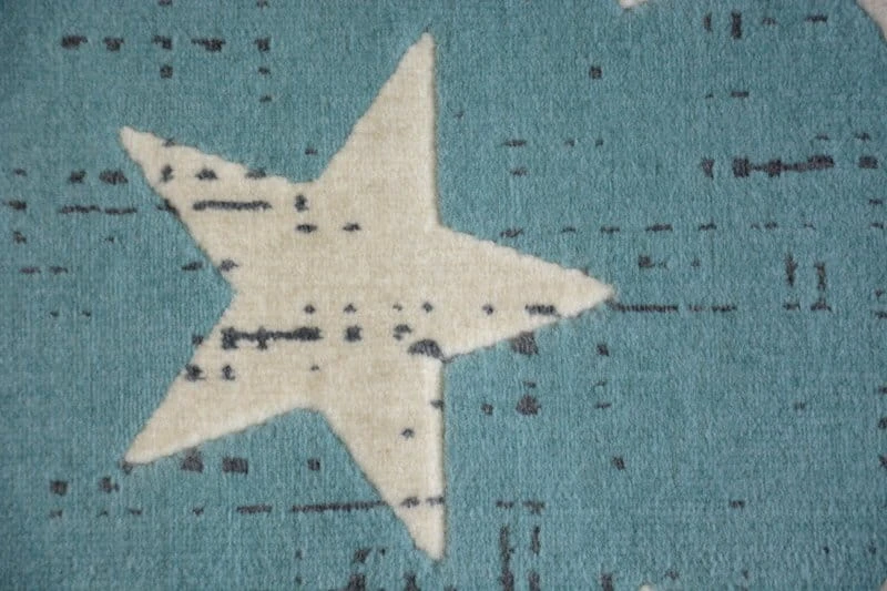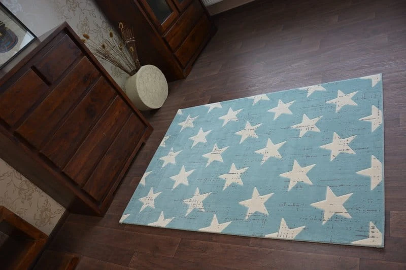 Niebieski dywan z motywem gwiazdek, który idealnie sprawdzi się w dziecięcym pokoju lub korytarzu, dodając wnętrzu radosny charakter.