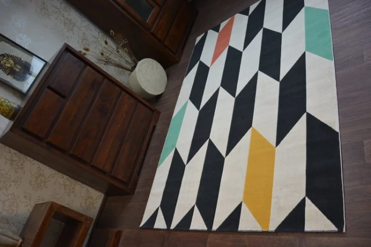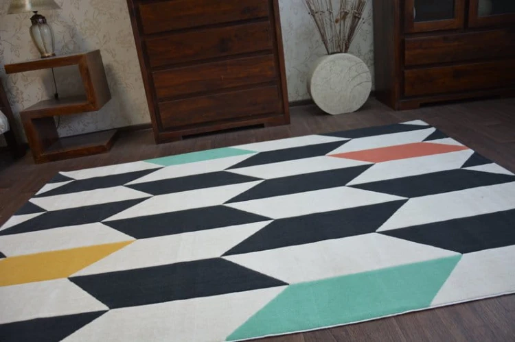 Wielokolorowy dywan z geometrycznym wzorem rombów, który doda wnętrzu energii i skandynawskiego charakteru.