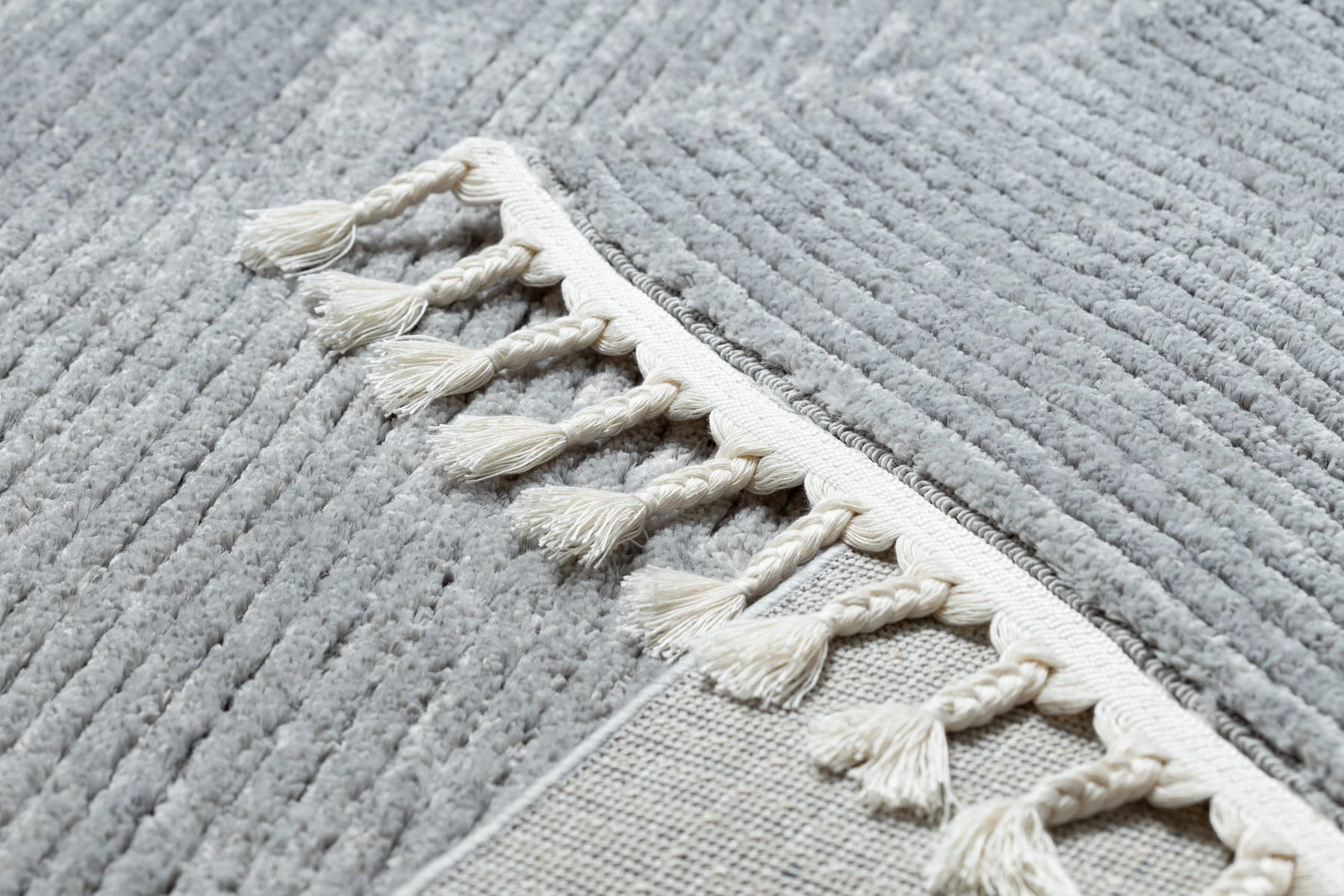 Szary dywan shaggy z subtelnym wzorem w paski, który doda salonowi spokojny charakter i przytulną atmosferę.