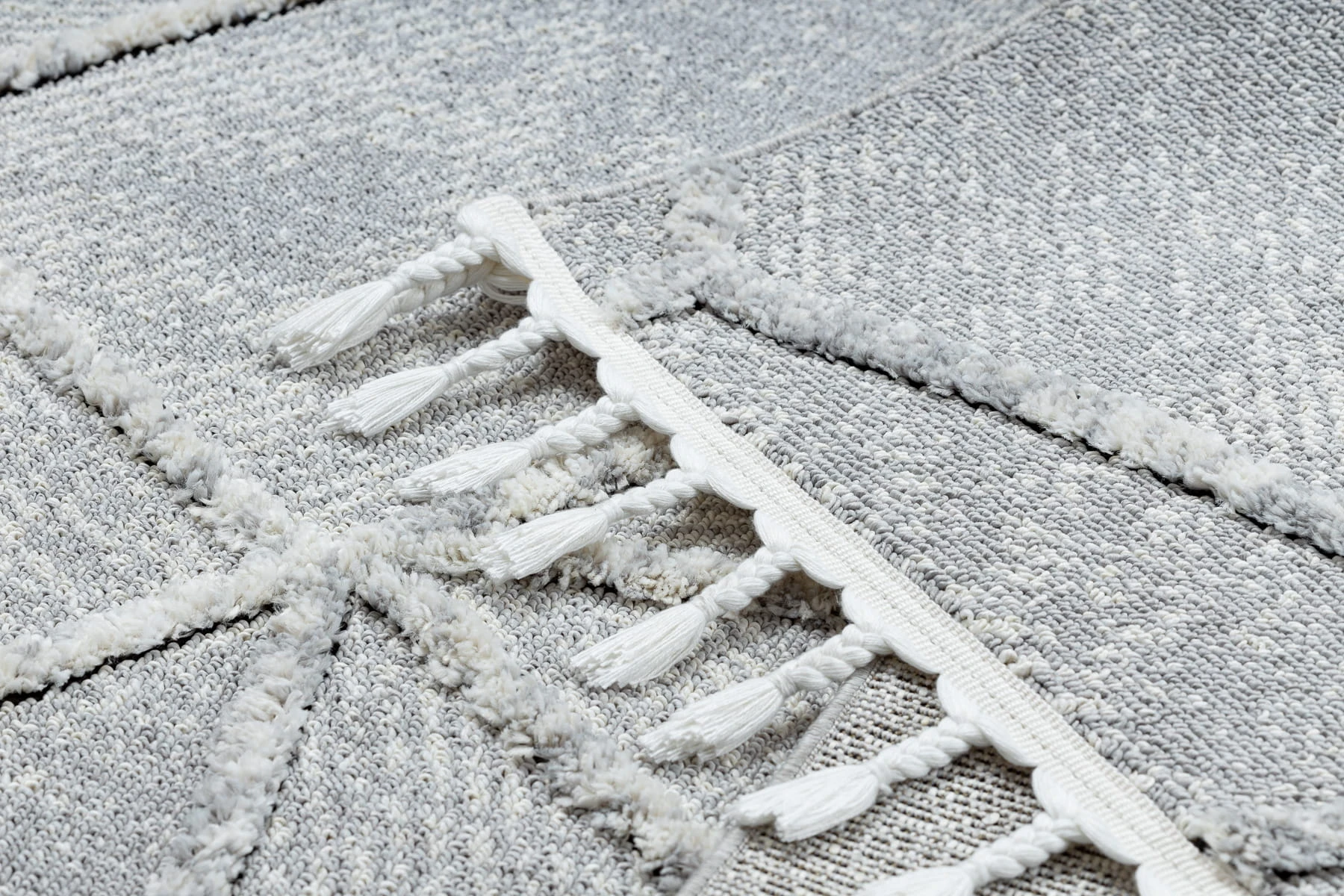 Szary dywan shaggy z runem 16 mm i geometrycznym wzorem mozaiki, który doda salonowi nowoczesny charakter.
