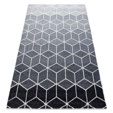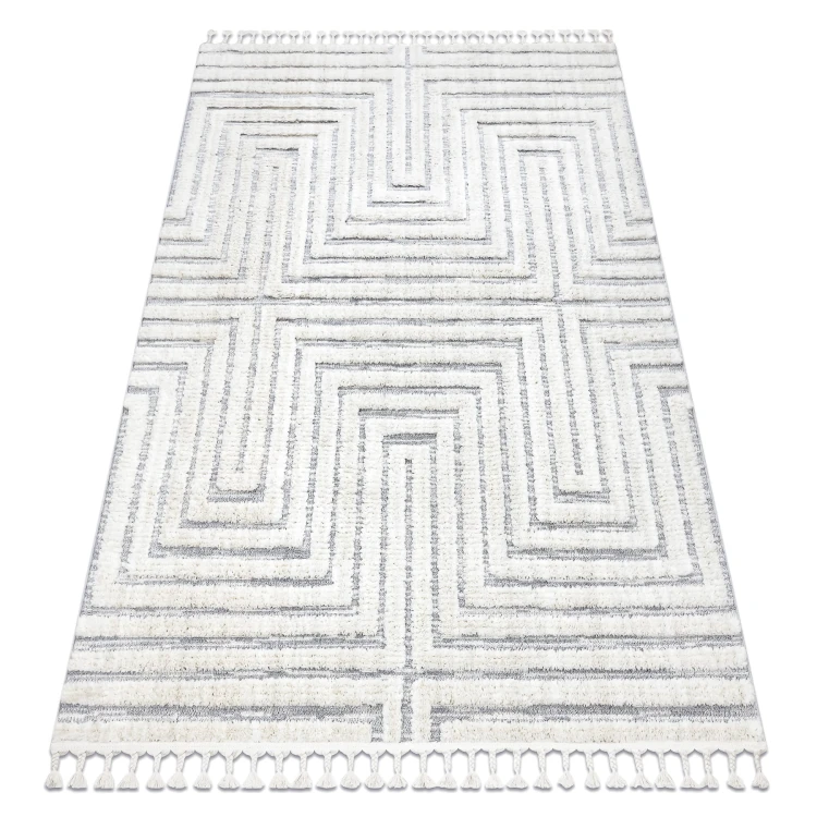 Szaro-biały dywan shaggy z geometrycznym wzorem labiryntu, który doda salonowi nowoczesny charakter i stworzy efektowny punkt centralny.