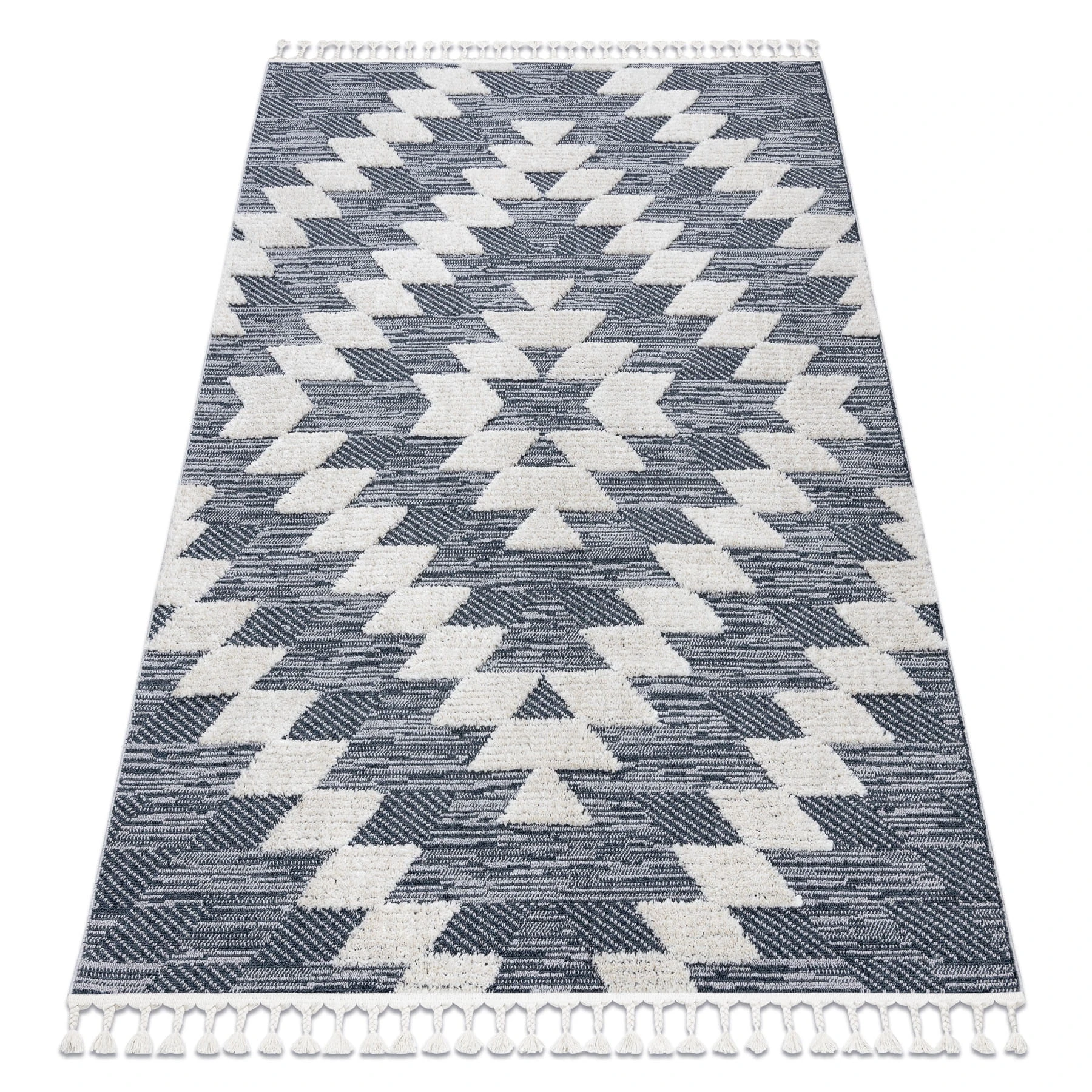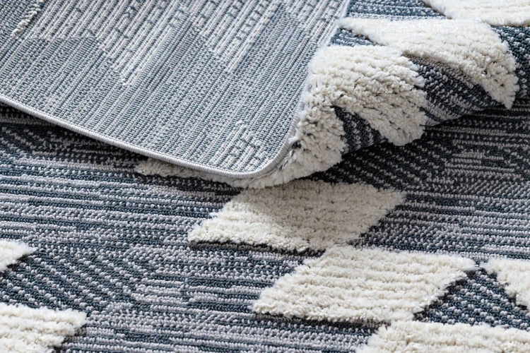 Antracytowy dywan shaggy z geometrycznym wzorem rombów, który doda salonowi nowoczesny charakter.