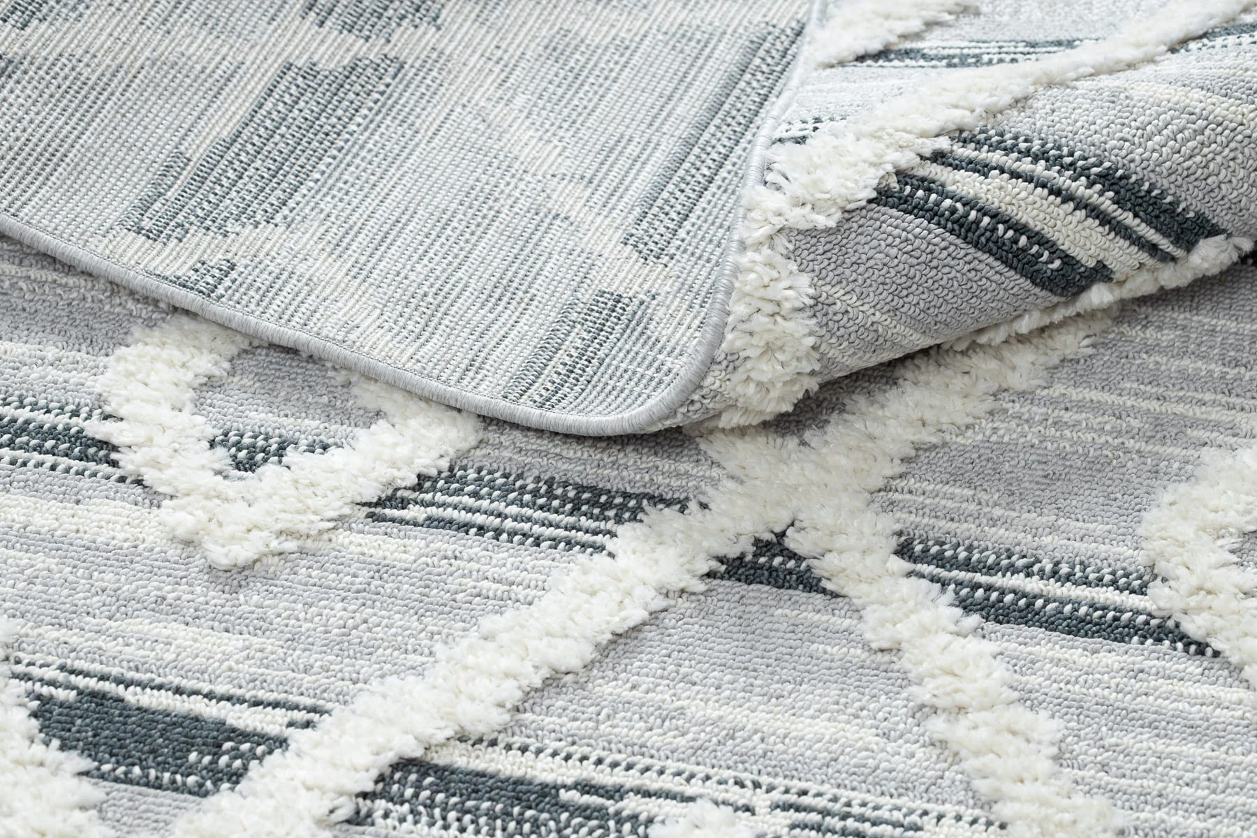 Szary dywan shaggy z geometrycznym wzorem kratki, który doda wnętrzu nowoczesny charakter i przytulną atmosferę.