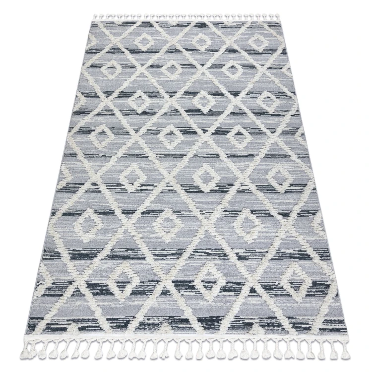Szary dywan shaggy z geometrycznym wzorem kratki, który doda wnętrzu nowoczesny charakter i przytulną atmosferę.