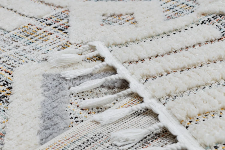 Szaro-żółty dywan shaggy z geometrycznym wzorem rombów, który ożywi salon ciepłym akcentem kolorystycznym.