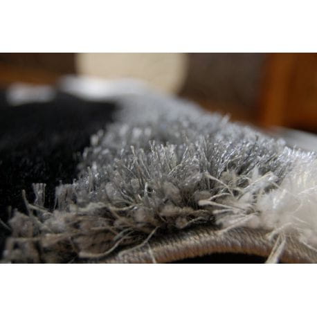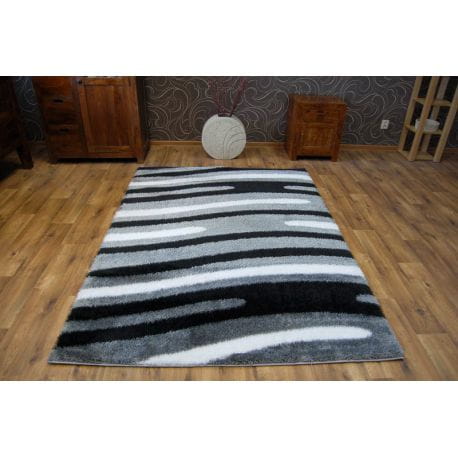Szary dywan shaggy z runem 30 mm i wzorem w paski, który nada korytarzowi nowoczesny charakter i przytulną atmosferę.