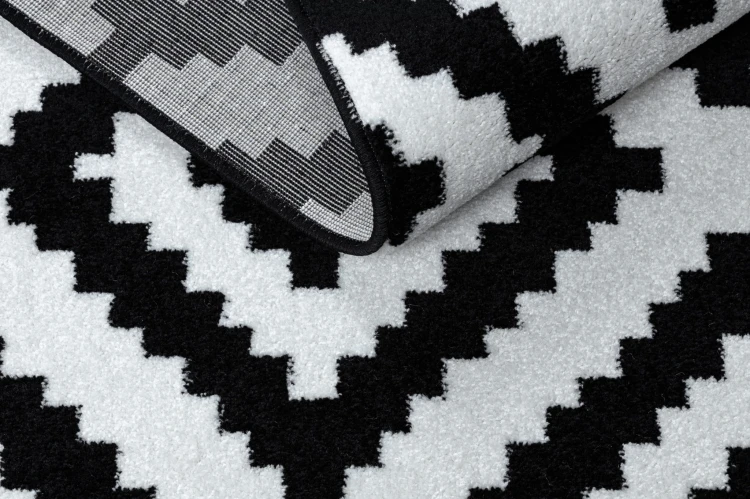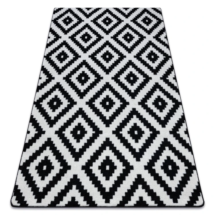 Kremowo-czarny dywan z geometrycznym wzorem kwadratów, który doskonale wpisze się w nowoczesny salon lub pokój.