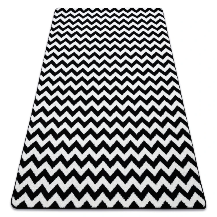 Kremowo-czarny dywan z geometrycznym wzorem zygzak, który wprowadzi do salonu nowoczesny, graficzny akcent.