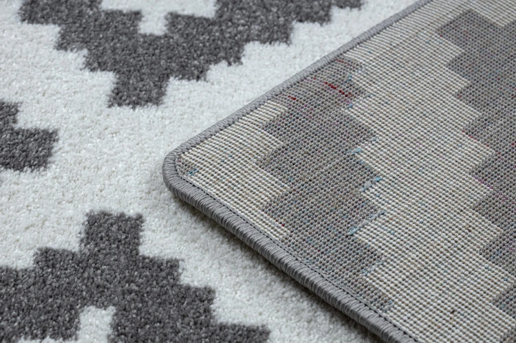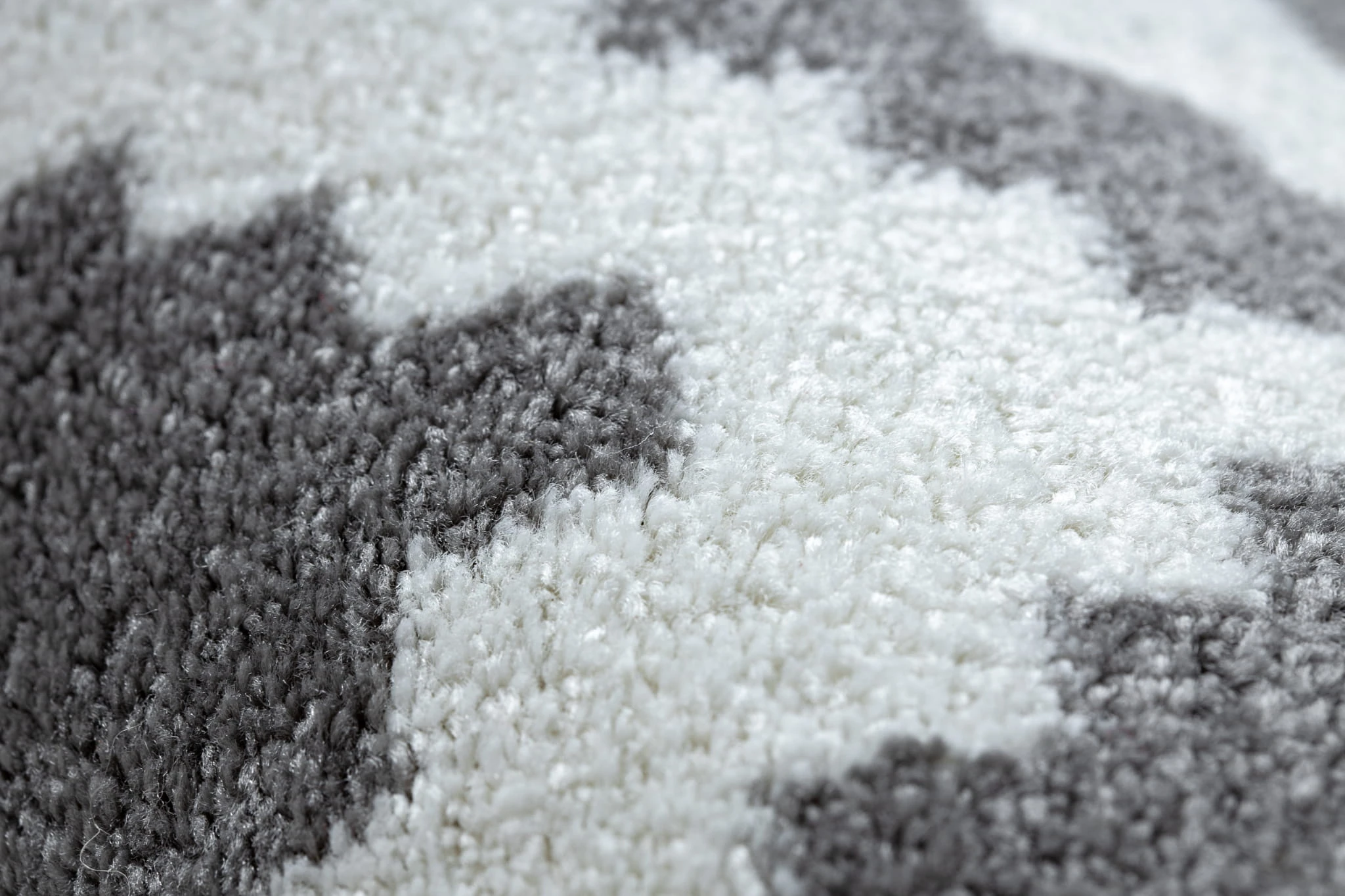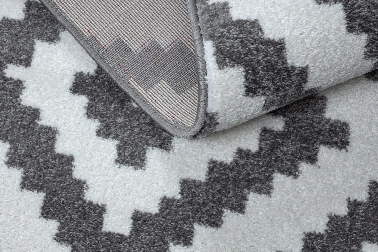 Kremowo-szary dywan z geometrycznym wzorem, który doskonale wpisze się w nowoczesny salon lub pokój.