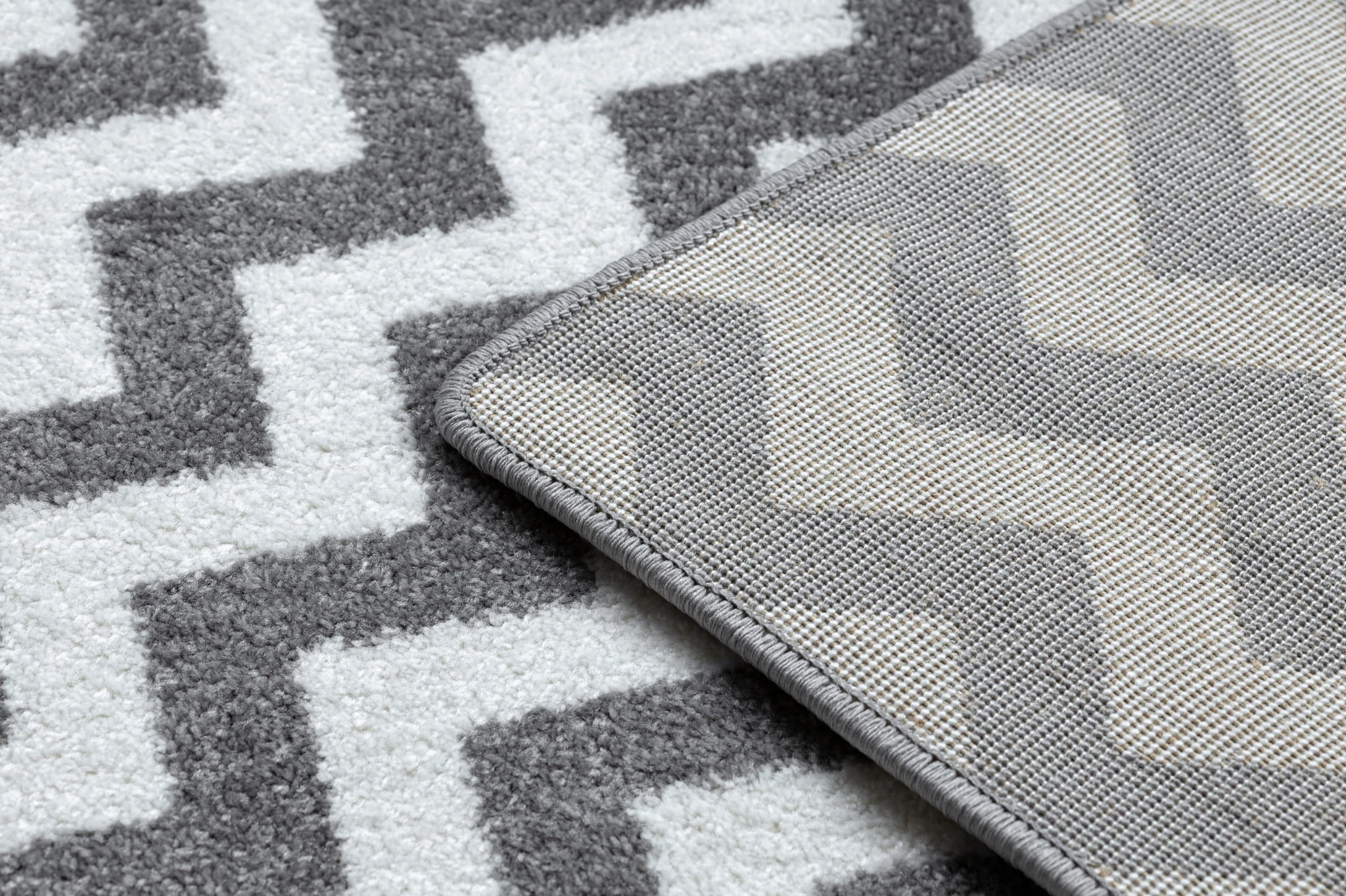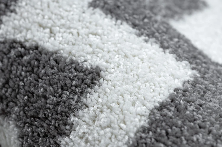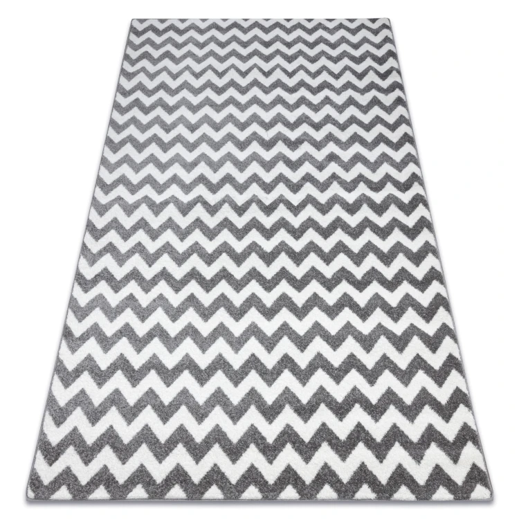 Szaro-biały dywan z wyrazistym geometrycznym wzorem, który doda salonowi nowoczesny charakter i stanowi doskonały punkt centralny wnętrza.