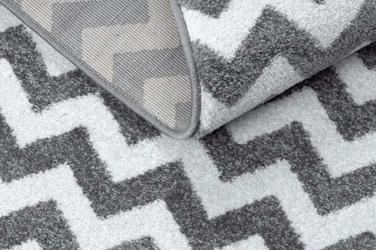 Szaro-biały dywan z geometrycznym wzorem zygzaka, który doskonale sprawdzi się w korytarzu, nadając mu nowoczesny charakter.