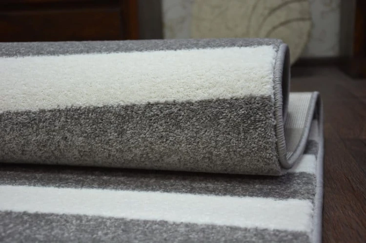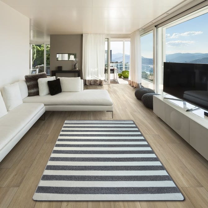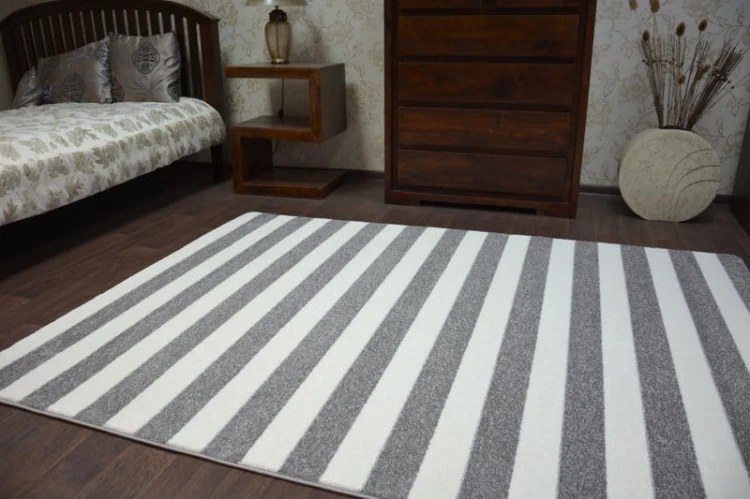 Szaro-biały dywan w pasy z krótkim runem 13 mm, który nadaje salonowi lub pokojowi nowoczesny charakter.