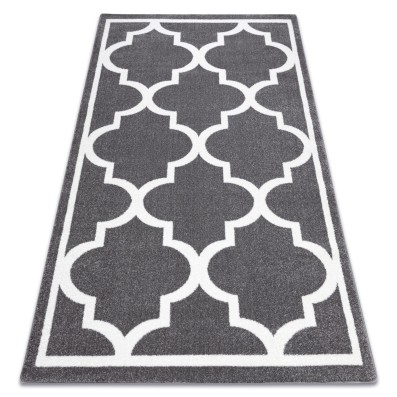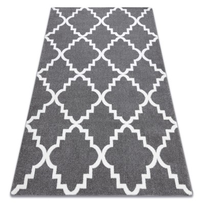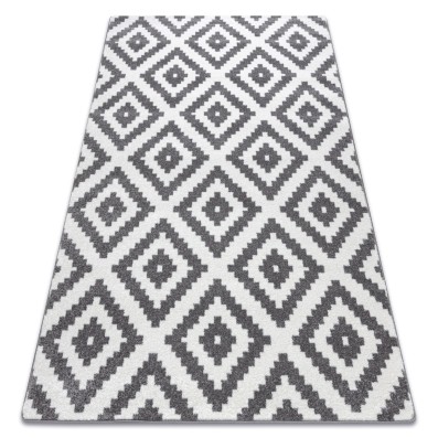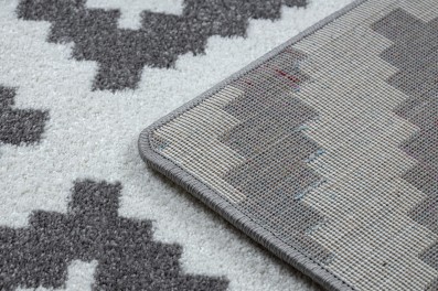 Szaro-biały dywan z wyrazistym geometrycznym wzorem, który doda salonowi nowoczesny charakter i stanowi doskonały punkt centralny wnętrza.