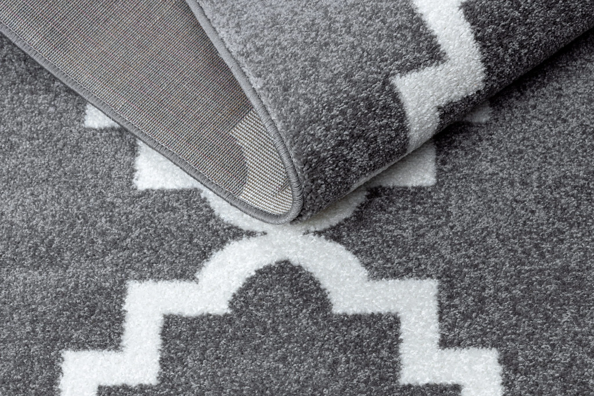 Szaro-biały dywan z geometrycznym wzorem marokańskiej koniczyny, który wprowadzi do salonu lub pokoju elegancki, orientalny charakter.