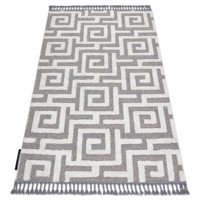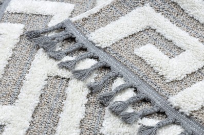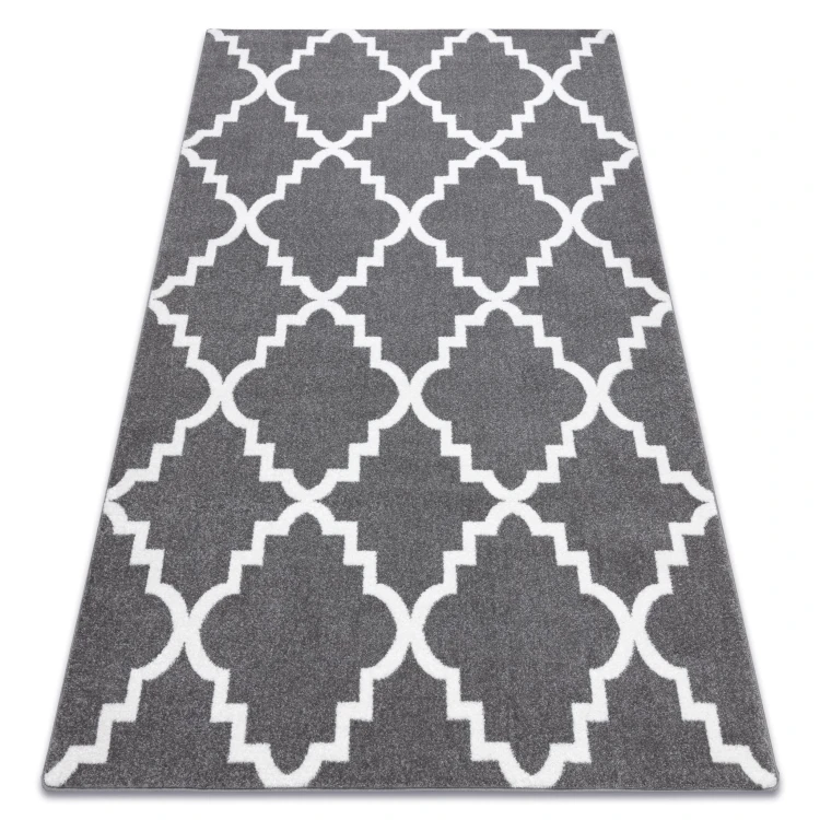 Szaro-biały dywan z geometrycznym wzorem marokańskiej koniczyny, który wprowadzi do salonu lub pokoju elegancki, orientalny charakter.