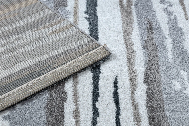 Szary dywan z abstrakcyjnym wzorem, który doskonale sprawdzi się w korytarzu, nadając mu nowoczesny charakter.