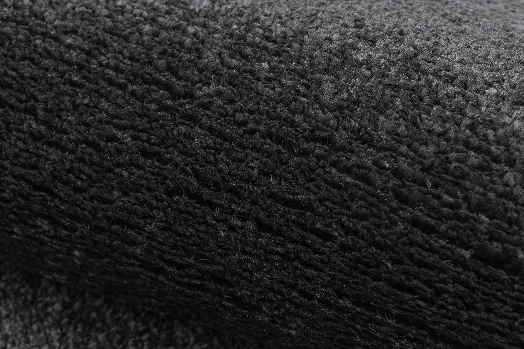 Czarny okrągły dywan z geometrycznym wzorem, który nada salonowi elegancki charakter i podkreśli nowoczesny styl wnętrza.