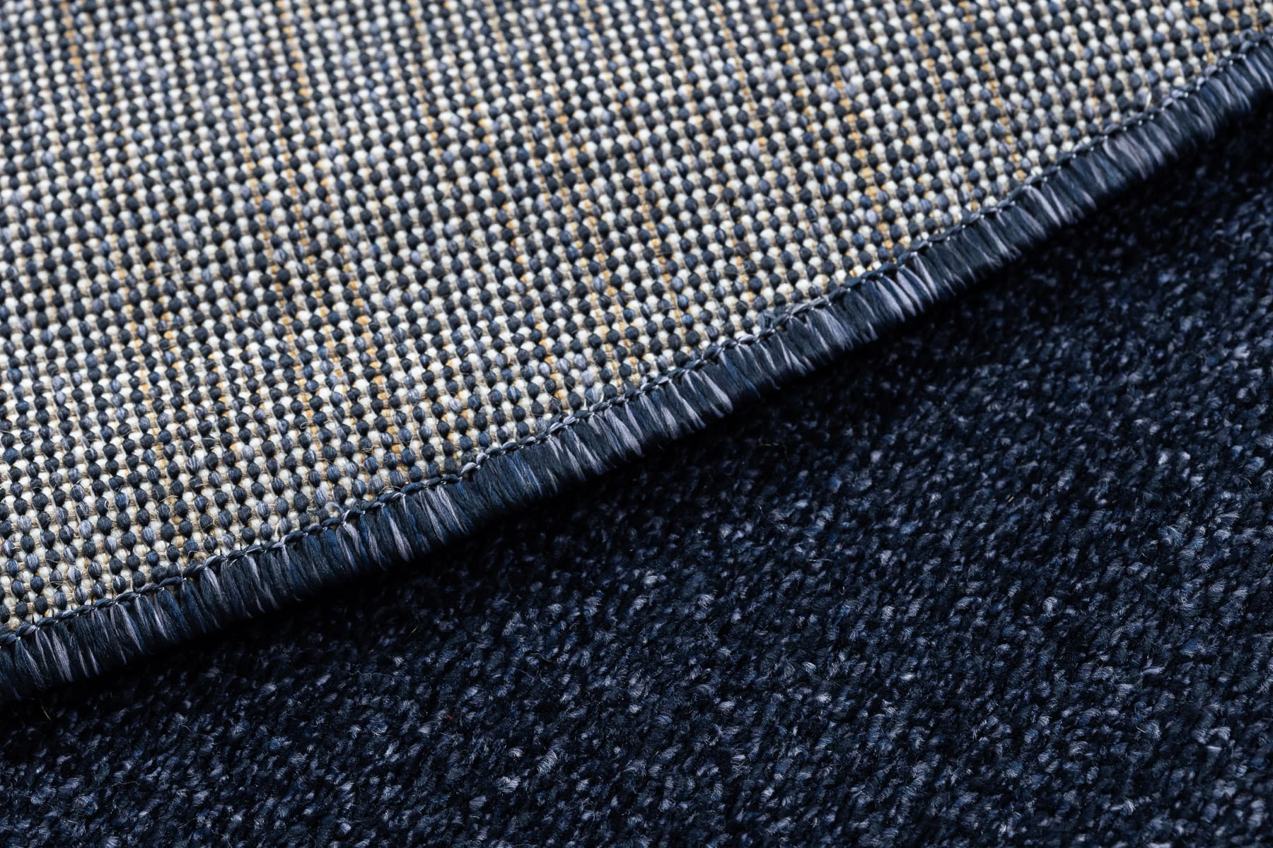 Niebieski okrągły dywan z geometrycznym wzorem, który doda salonowi lub pokojowi elegancki akcent kolorystyczny.