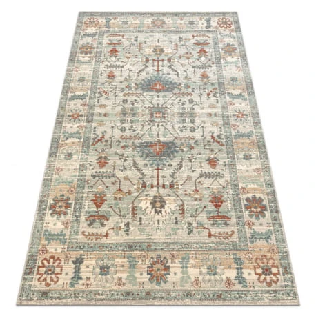 Beżowy dywan z delikatną zieloną ramką, który wprowadzi do salonu spokojną elegancję i subtelny akcent kolorystyczny.