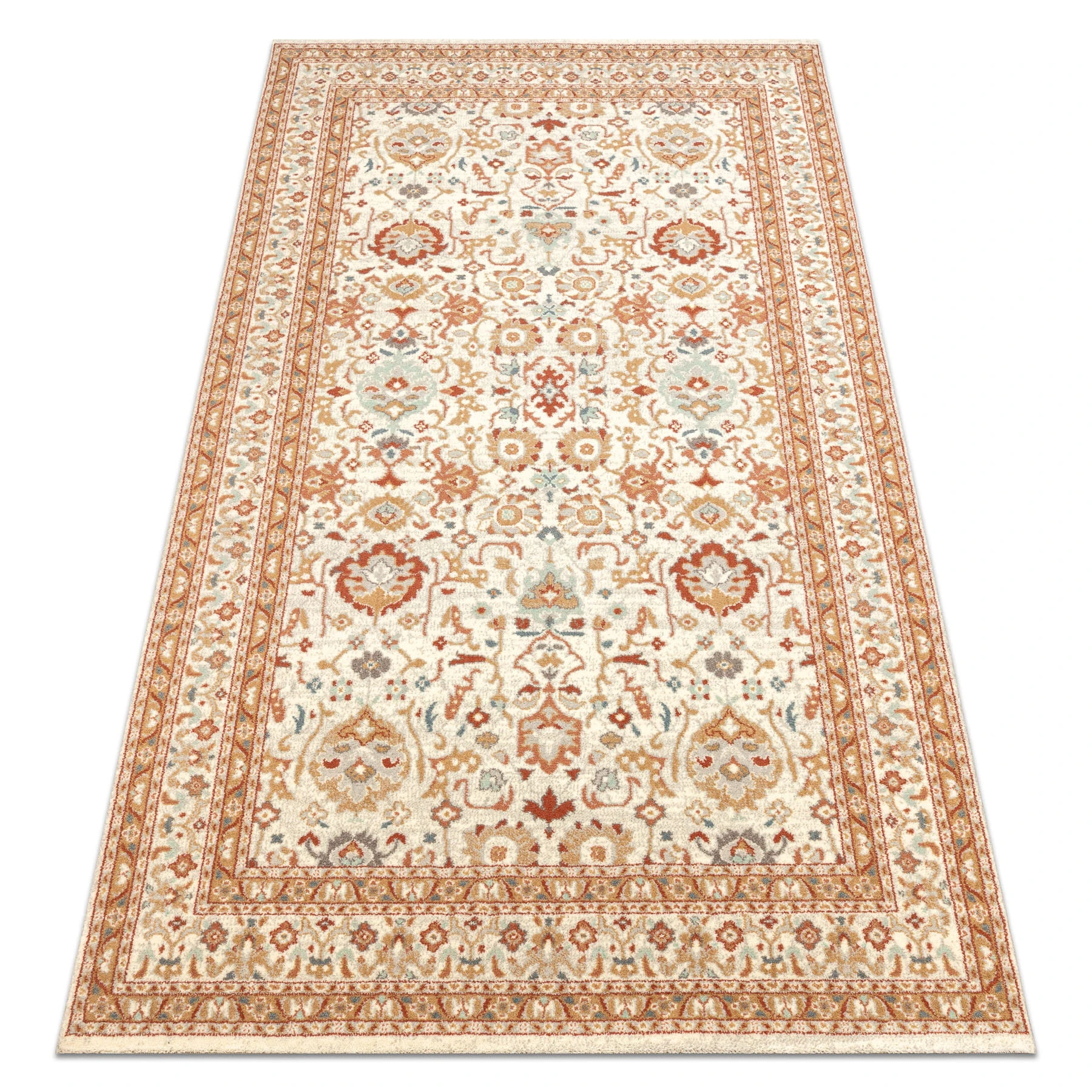 Beżowy dywan z wełny z ornamentowym wzorem w ramce, który wprowadzi do salonu ciepłe, klasyczne piękno.