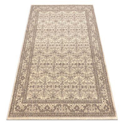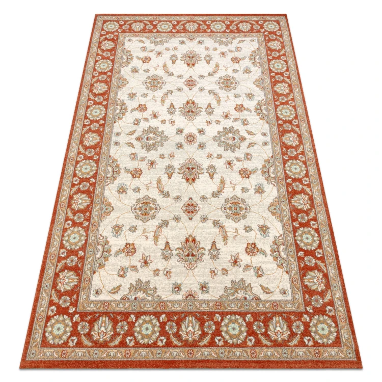 Wełniany dywan z tradycyjnym ornamentem w ciepłych odcieniach beżu i terakoty, który doda salonowi klasycznego charakteru.