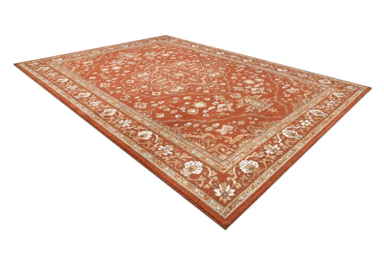 Terakotowy dywan z wełny z tradycyjnym wzorem, który wprowadzi do salonu ciepły, elegancki akcent.