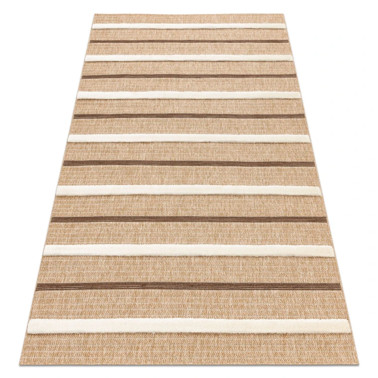 Beżowo-kremowy dywan z geometrycznym wzorem linii, który doskonale wpisze się w salon lub pokój, tworząc harmonijną i stonowaną atmosferę.