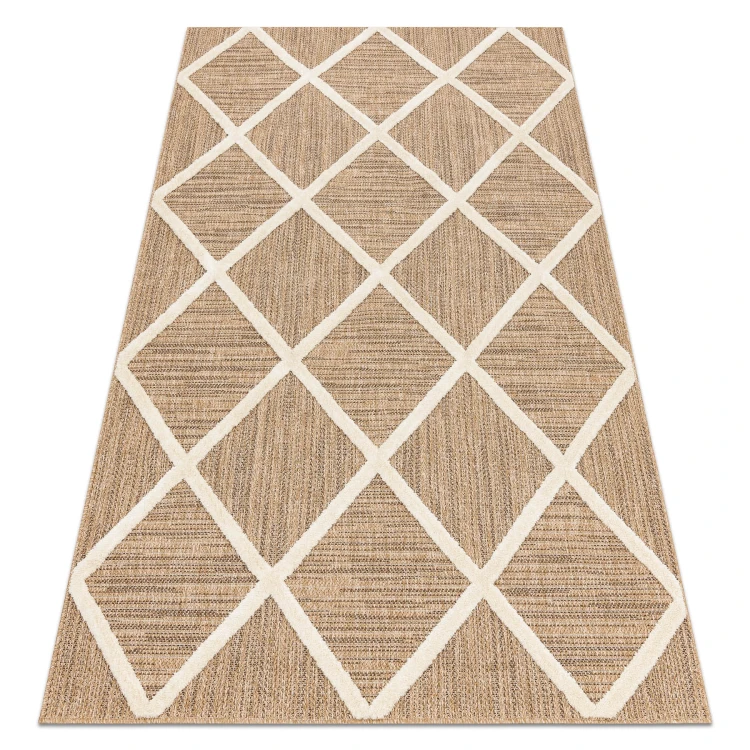 Beżowo-kremowy dywan z geometrycznym wzorem rombów, który doskonale wpisze się w salon i doda wnętrzu nowoczesny charakter.