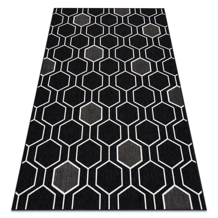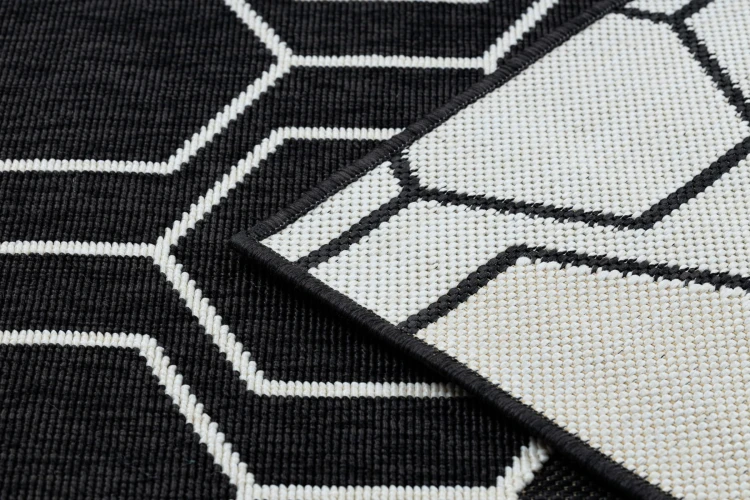Sznurkowy dywan w głębokiej czerni, odporny na warunki atmosferyczne, idealny na taras i balkon.
