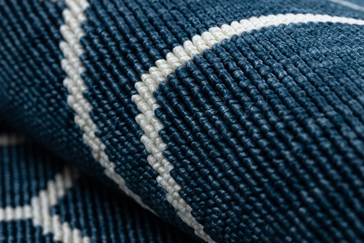 Sznurkowy dywan w odcieniach niebieskiego, odporny na warunki atmosferyczne, idealny na taras i balkon.