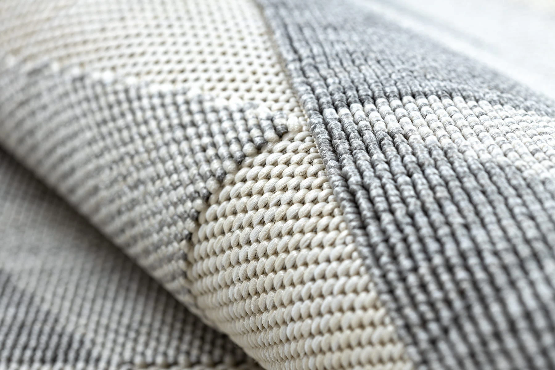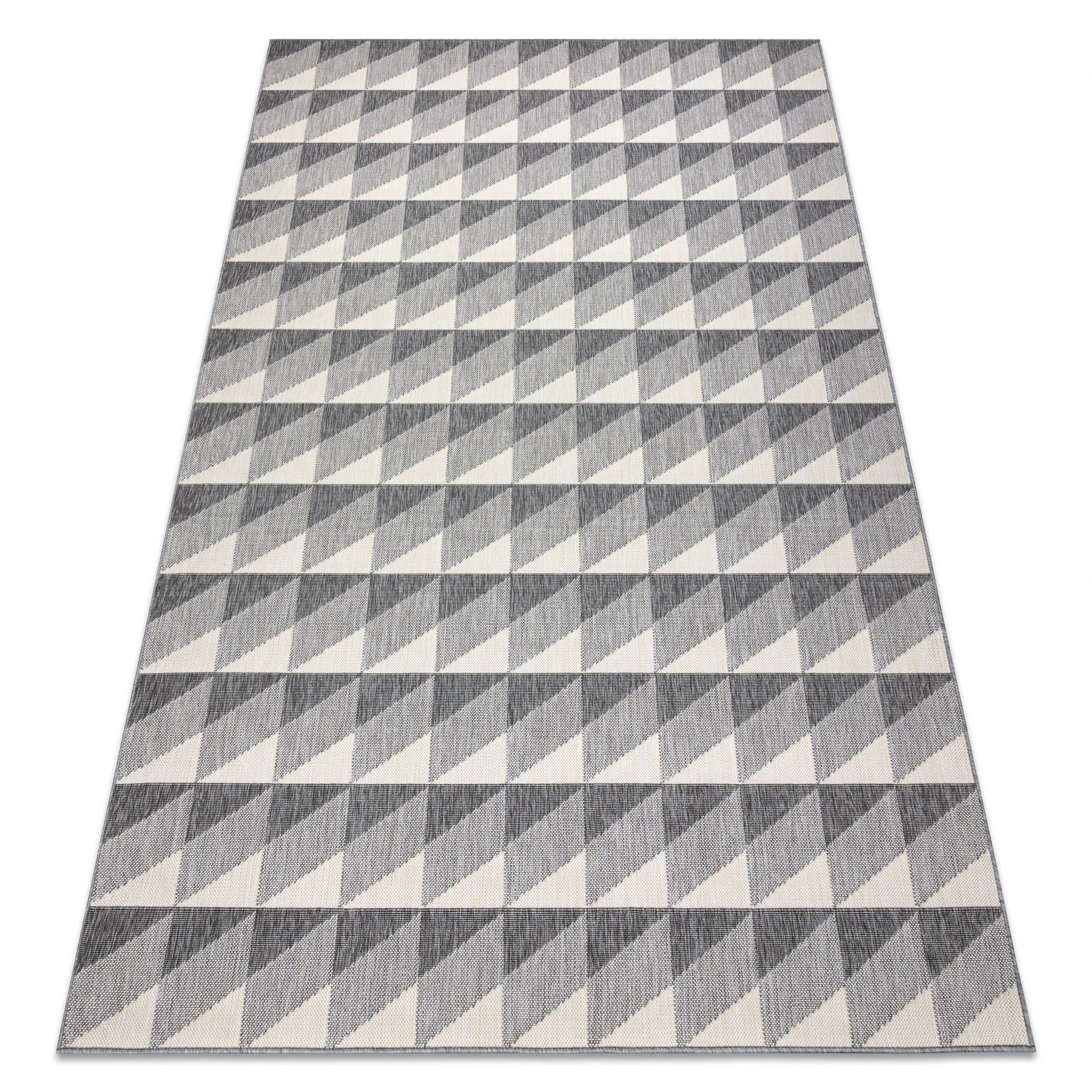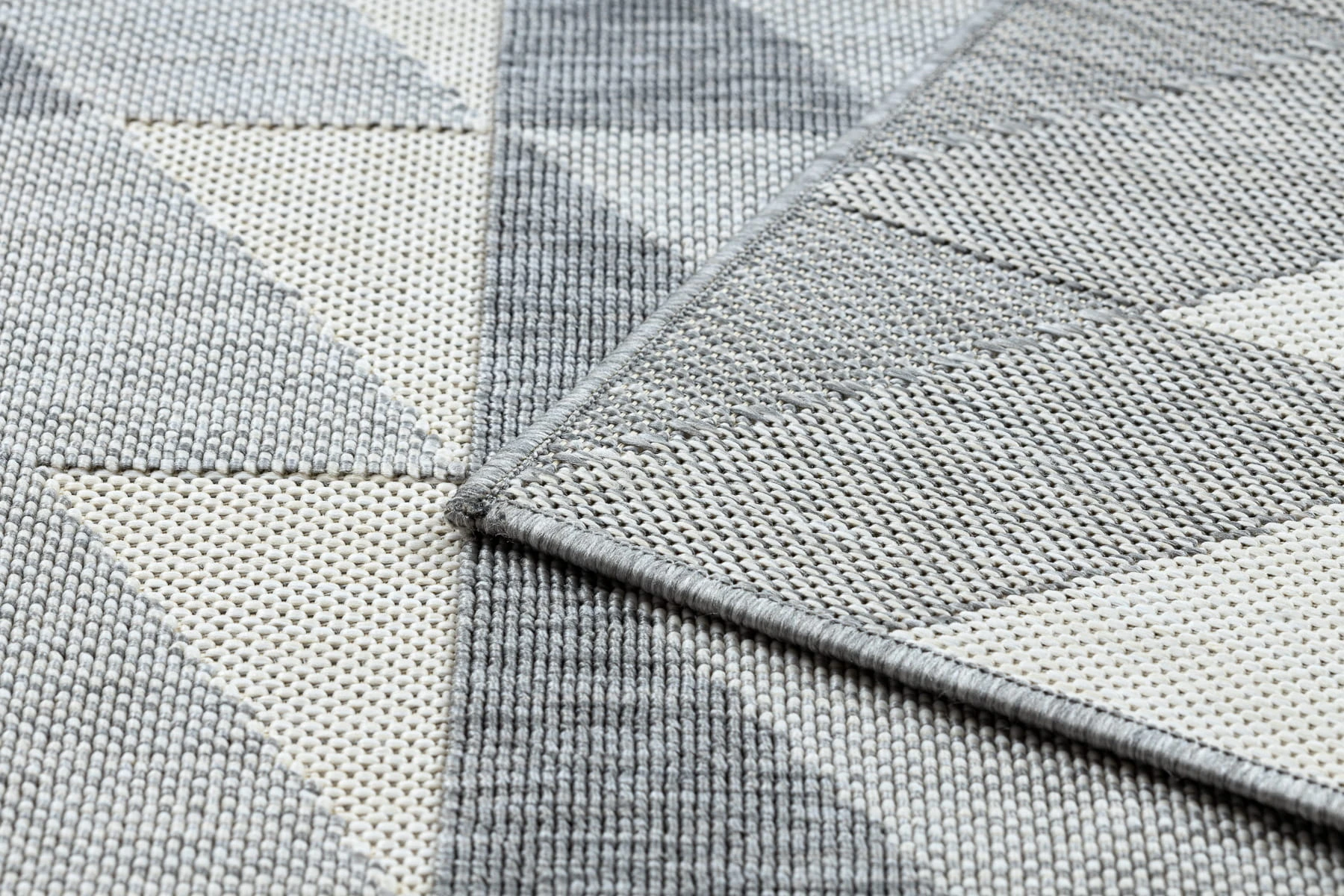 Szary dywan z geometrycznym wzorem rombów, który nadaje salonowi nowoczesny charakter i doskonale komponuje się z minimalistycznymi wnętrzami.