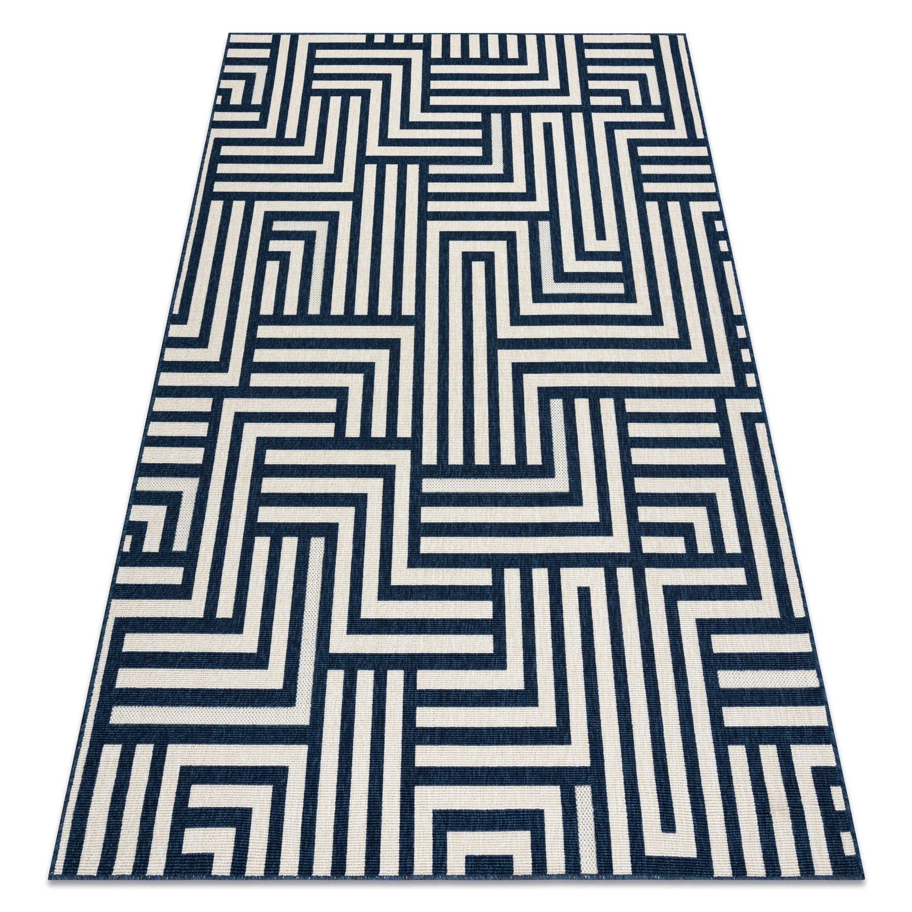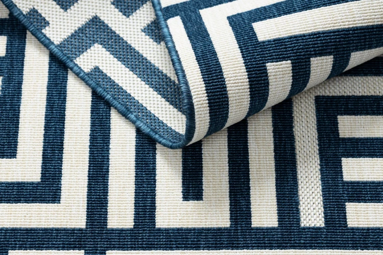 Prostokątny dywan z geometrycznym wzorem labiryntu, który nadaje korytarzowi nowoczesny charakter w przyjemnej kolorystyce kremu i błękitu.