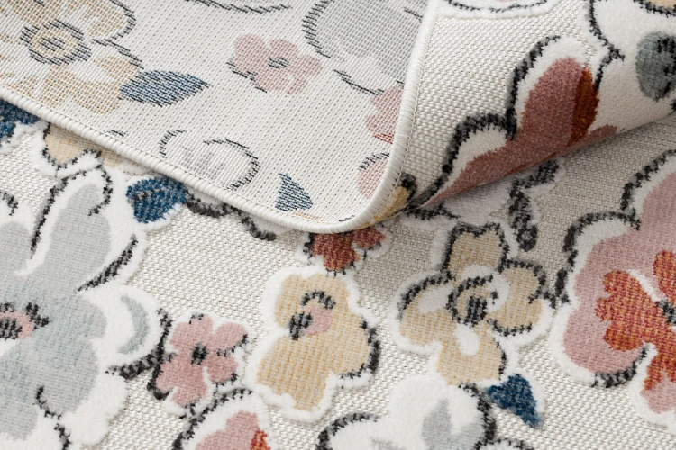 Wielokolorowy dywan z roślinnym wzorem, który wprowadzi do salonu naturalny, ciepły charakter.
