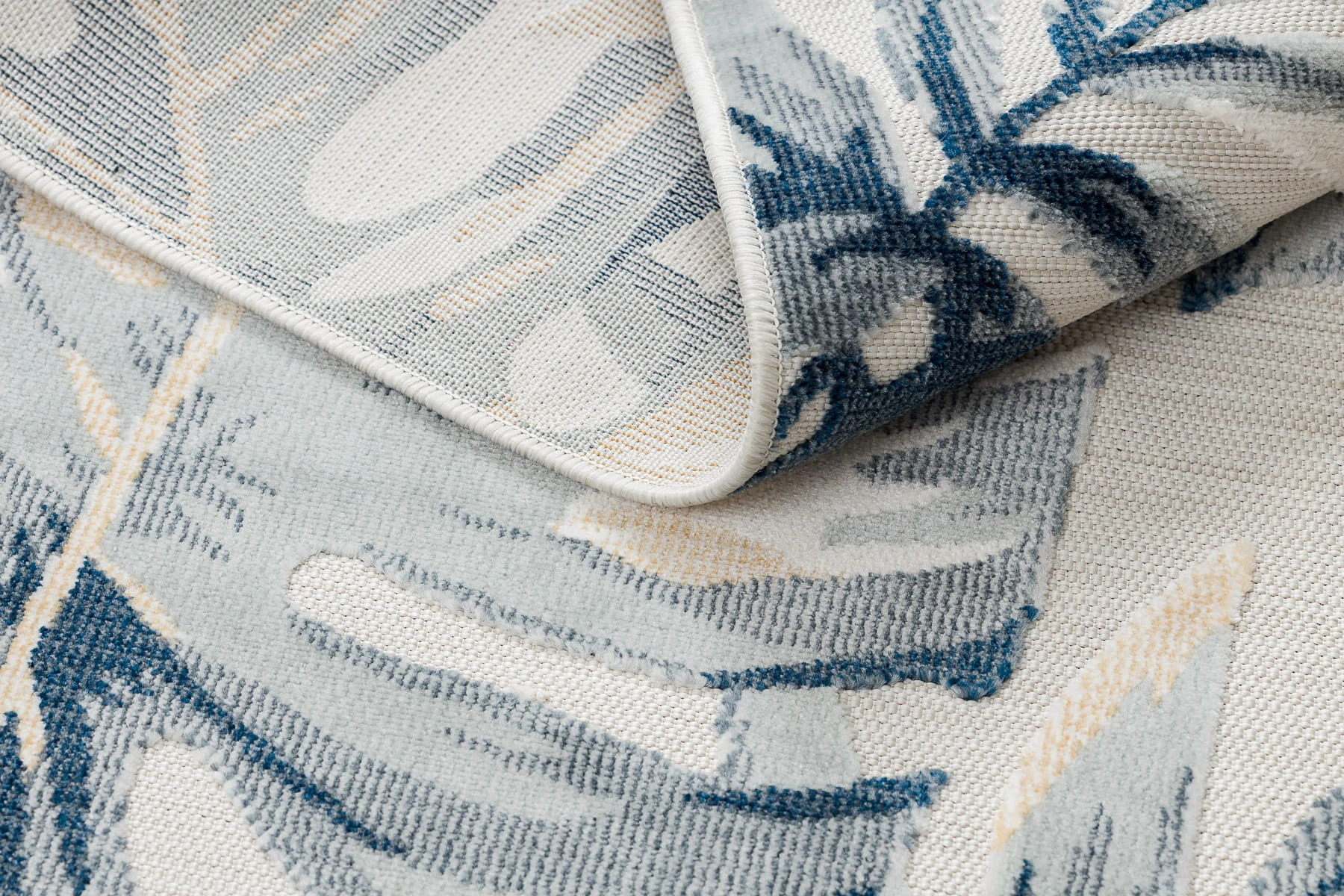 Kremowy dywan z botanicznym wzorem liści monstery, który wprowadzi do salonu naturalny, tropikalny akcent.