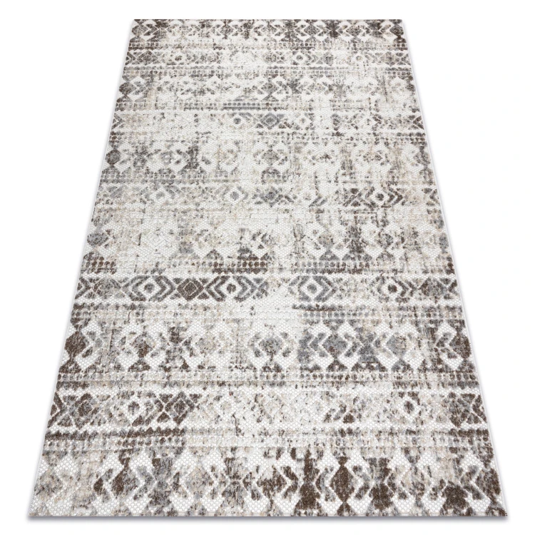 Beżowy dywan z abstrakcyjnym wzorem, który doskonale wpisze się w salon lub pokój, tworząc ciepłą i harmonijną atmosferę.