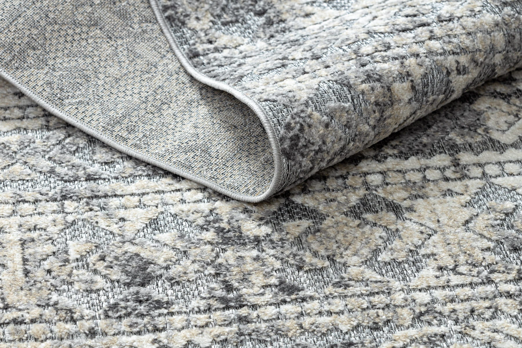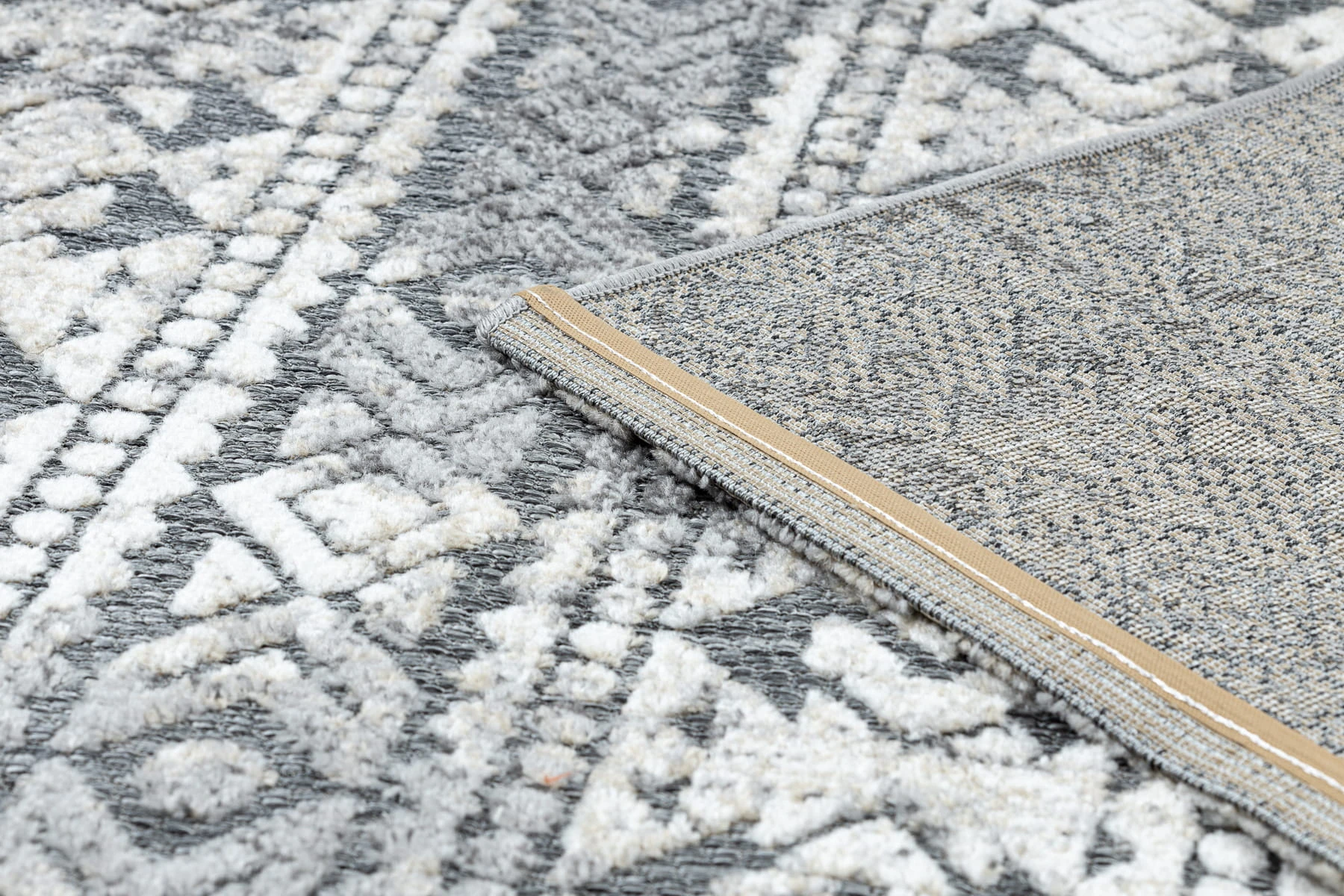 Szaro-beżowy dywan z abstrakcyjnym wzorem azteckim, który wprowadzi do salonu nowoczesny charakter z etnicznymi akcentami.