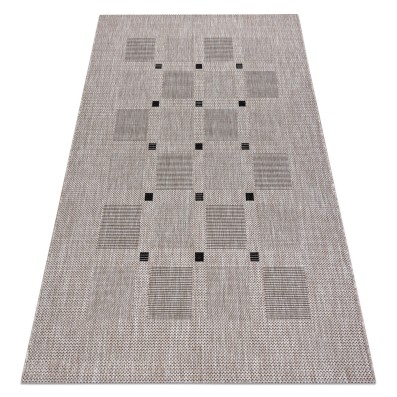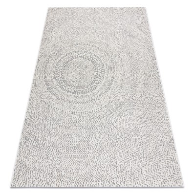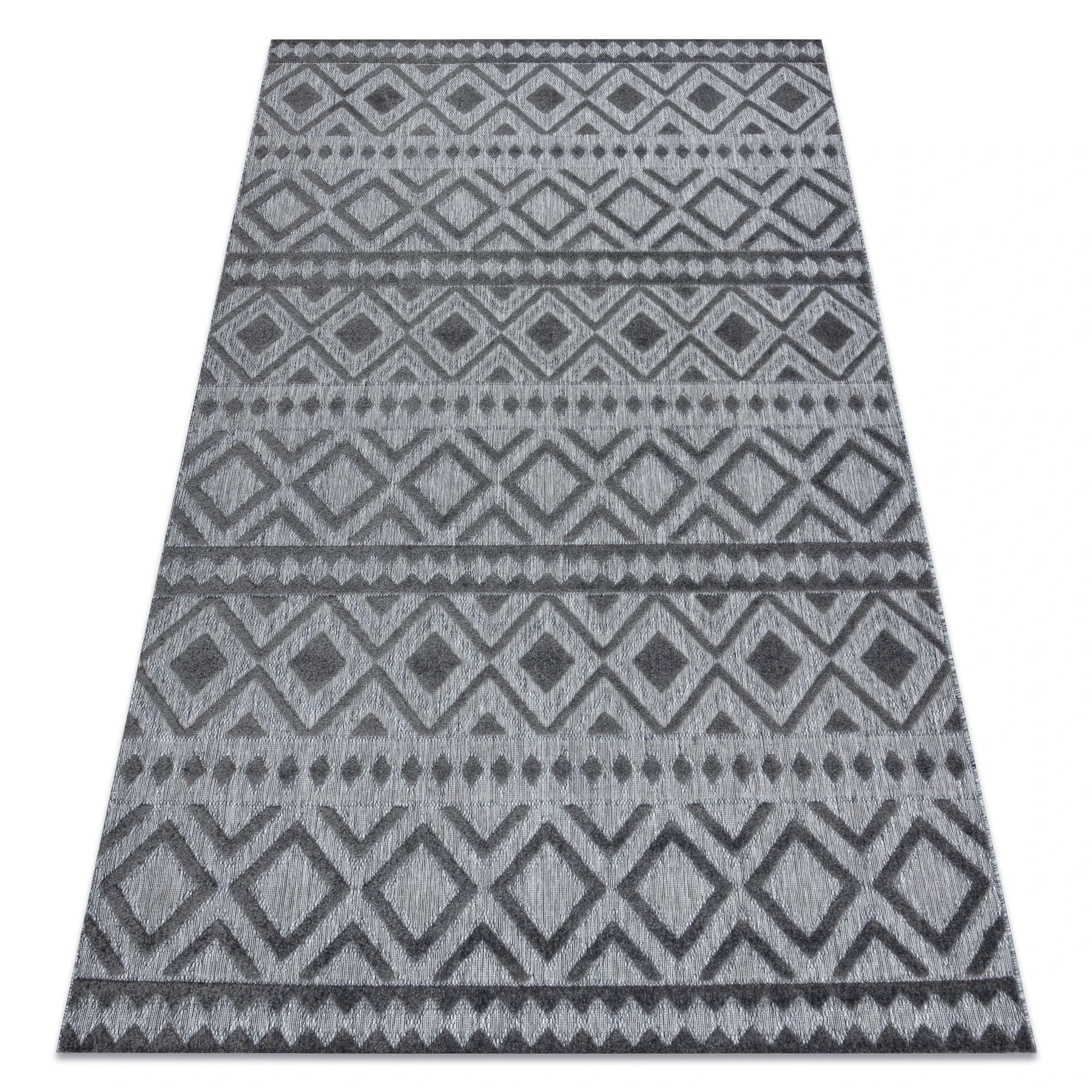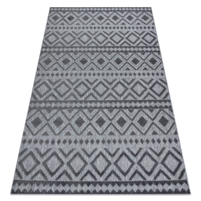 Szary dywan z geometrycznym wzorem w stylu boho, który doskonale sprawdzi się w salonie, dodając wnętrzu nowoczesnego charakteru.